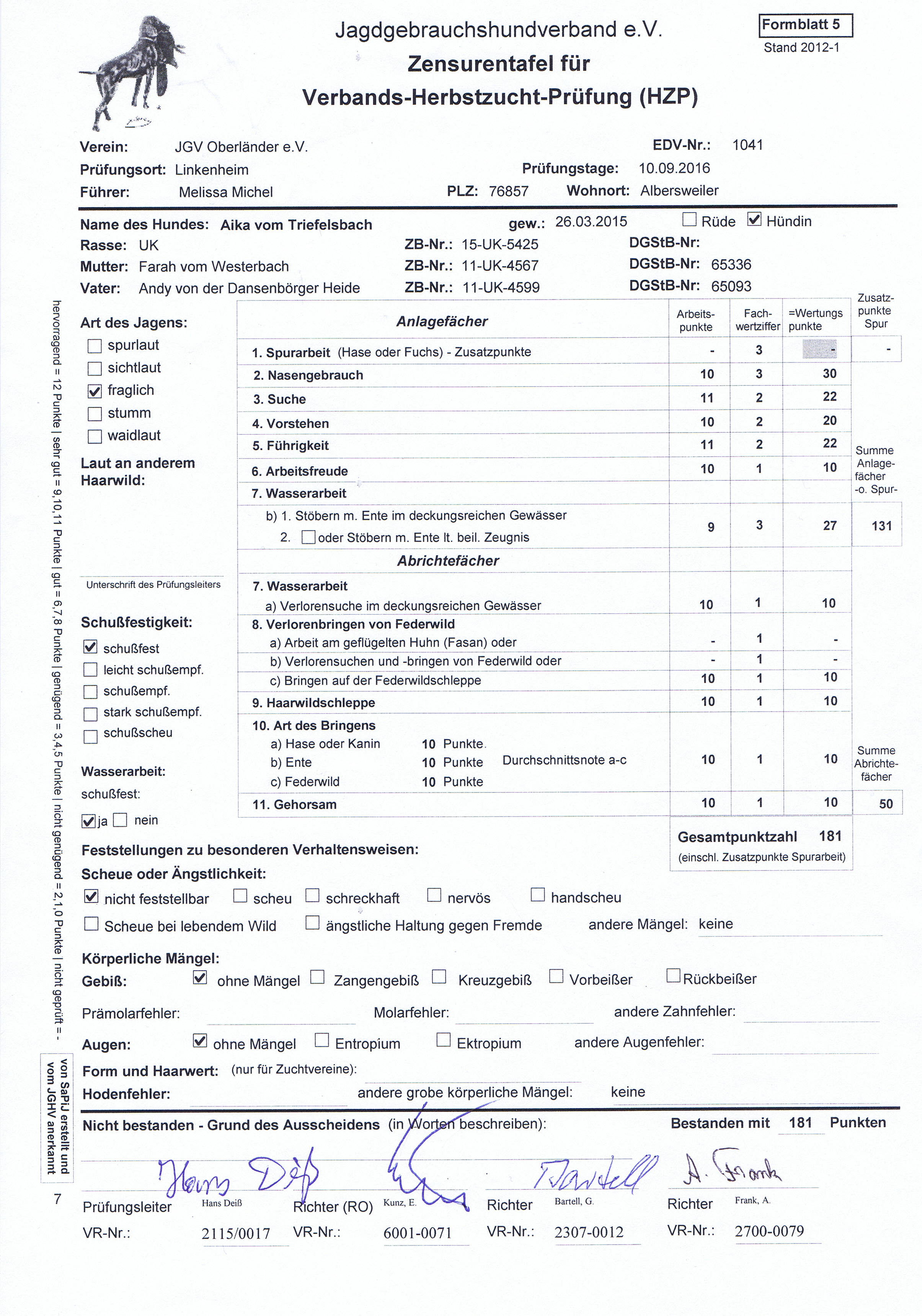 Herbstzuchtprüfung (HZP)Aika hat heute beim JGV Oberländer zusammen mit Ihrer Schwester Anni die HZP mit 181 Punkten bestanden.