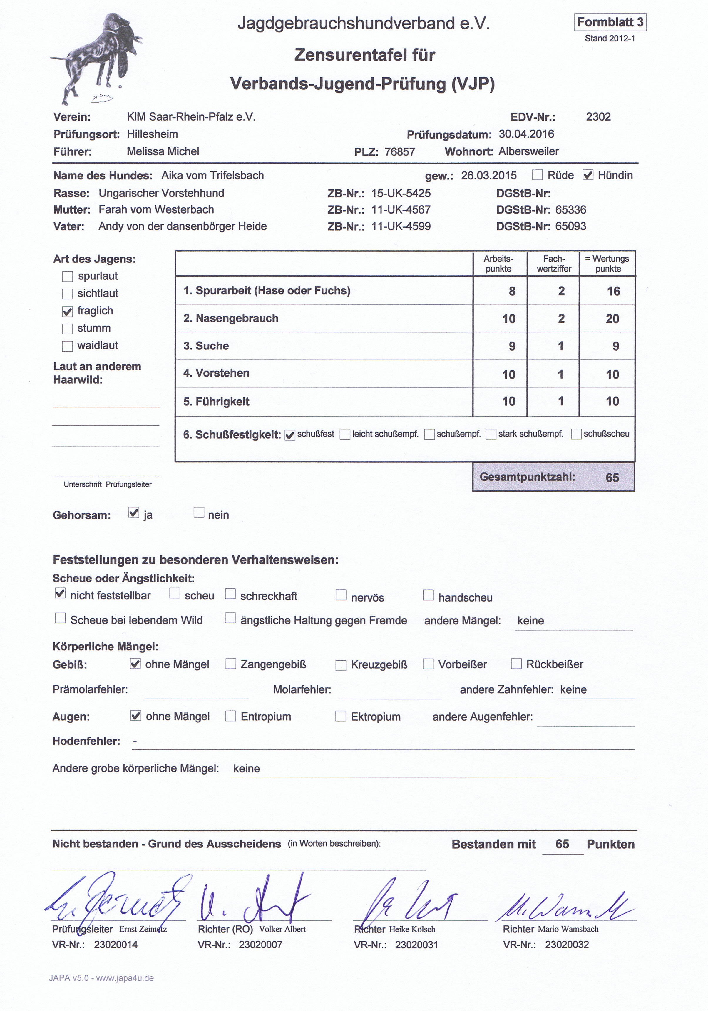 Aika hat am 30.04.2016 beim Verein kleine Münsterländer eine weitere VJP absolviert, nachdem wir bei der ersten Prüfung richtig Pech hatten . Diese hat sie mit 65 Punkten bestanden und wir haben somit die erste Hürde im Prüfungsleben unserer "großen" gemeistert. |