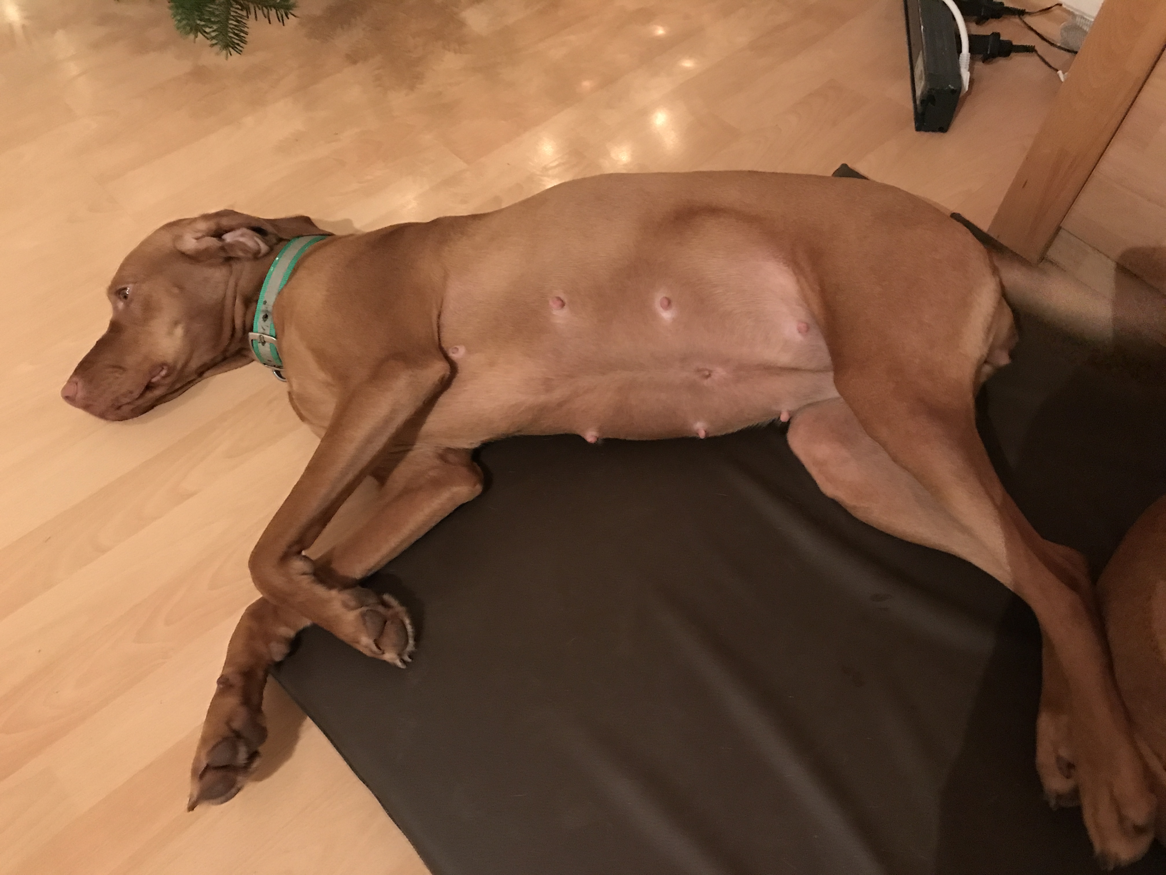 Inzwischen ist es mehr als offensichtlich, dass da was am Wachsen ist. Unsere grazile Aika verwandelt sich zusehends zum Hängebauchschwein. Nicht nur die Figur, nein auch das Fressverhalten gleicht der Spezies "porcus hängedus" Auch die Zitzen nehmen inzwischen eine Mischfarbe zwischen Ferkelrosa und Lillifee-Pink ein. Alles bereitet sich vor. So können wir heute ganz offiziell verkünden: Aika ist tragend.... |