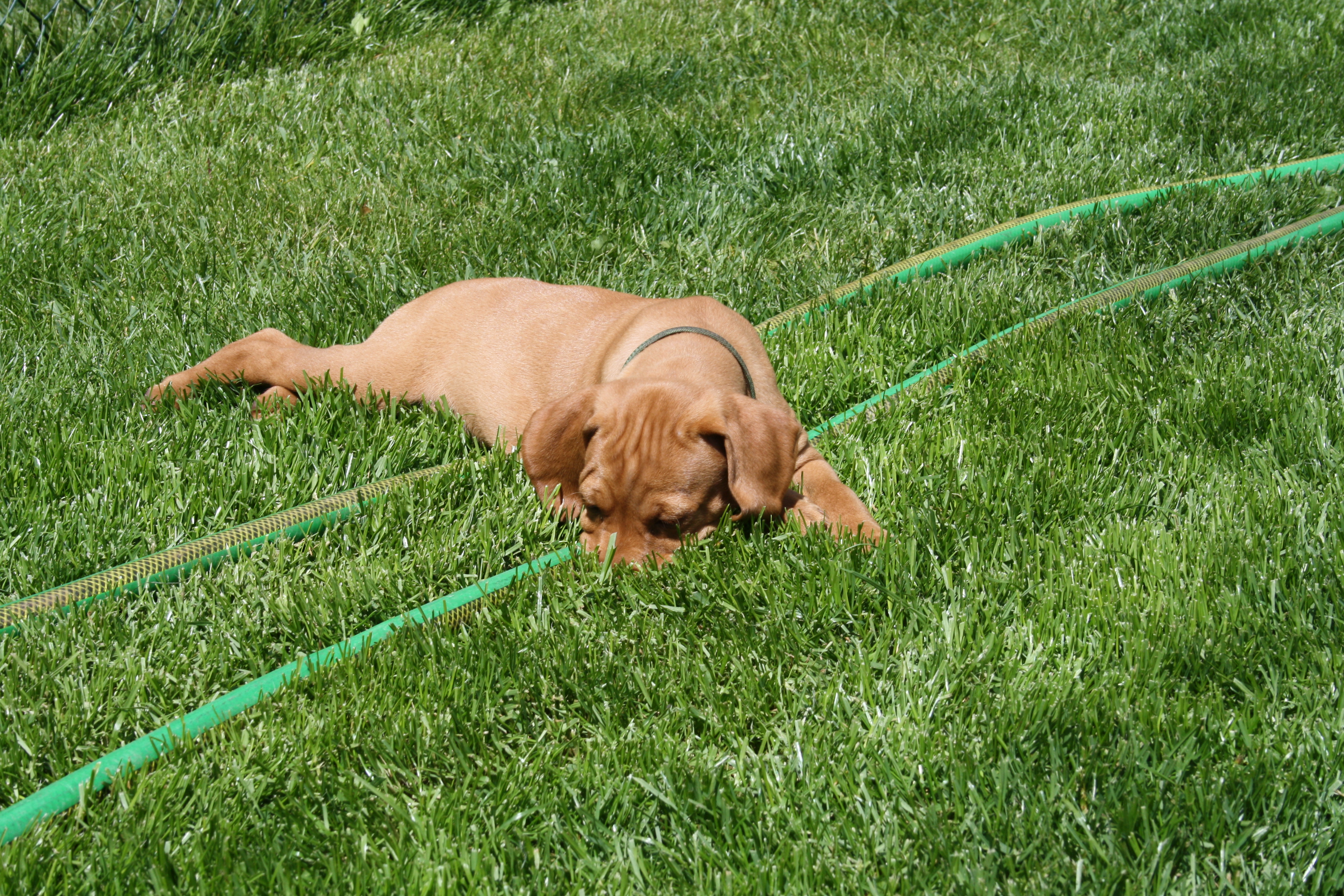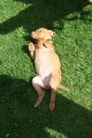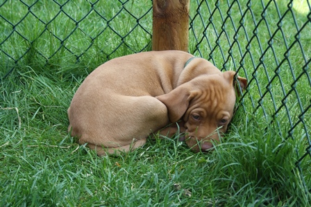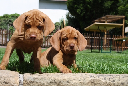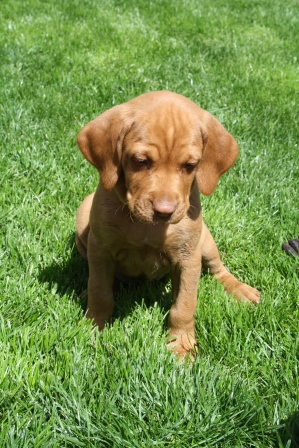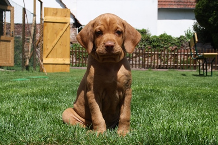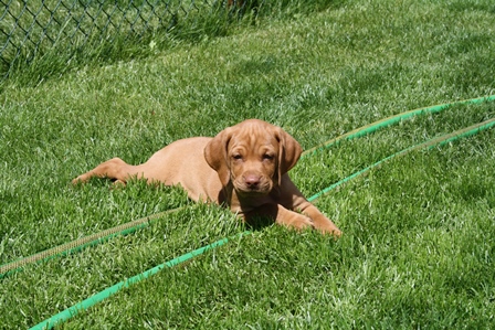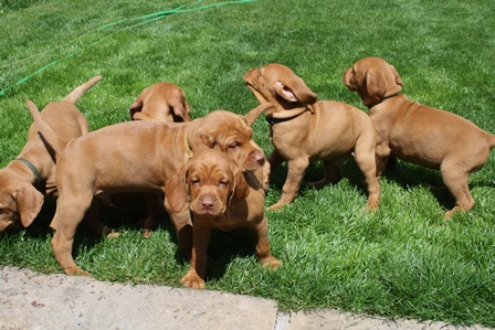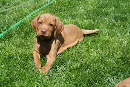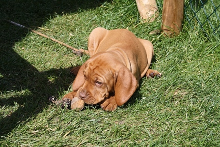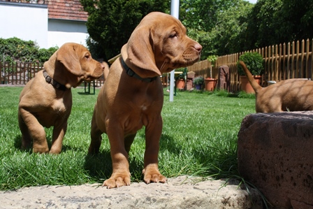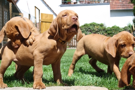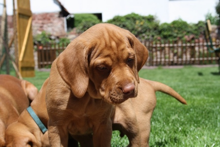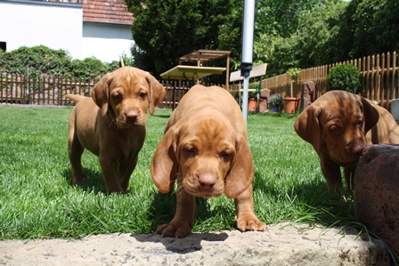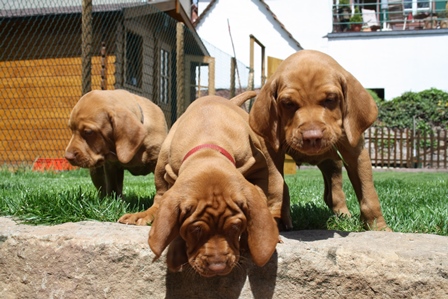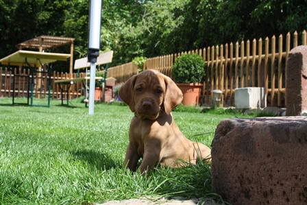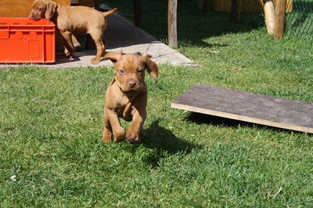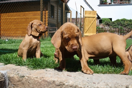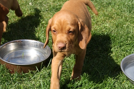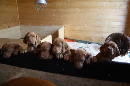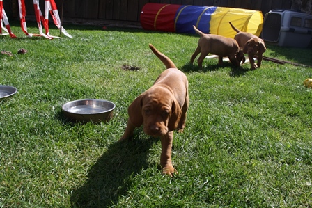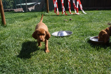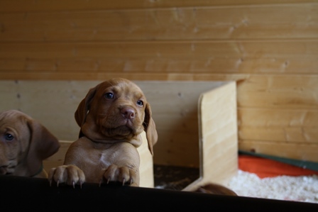 Alle Welpen entwickeln sich ihrem Alter entsprechend, zeigen keine Scheue und sind wie es sich für Vizslas gehört sehr menschenbezogen. Alle haben inzwischen die 4 kg Marke geknackt und wir sagen schon lange nicht mehr "Welpenfütterung" sondern nur noch "Raubtierfütterung". Besonders wenn es Mett gibt muss man auf seine Finger achten.