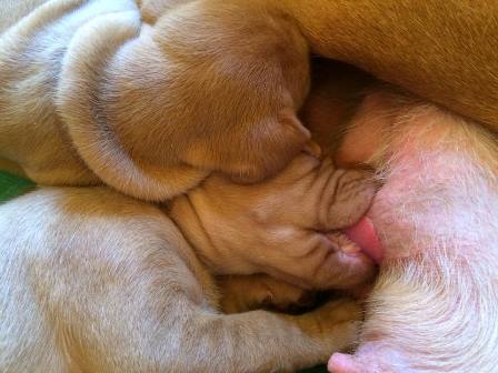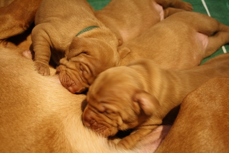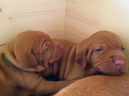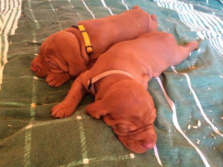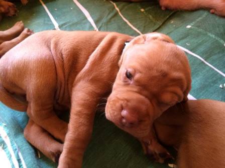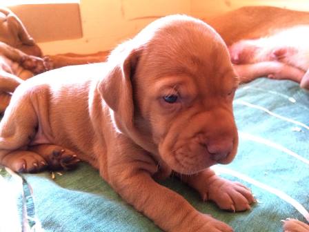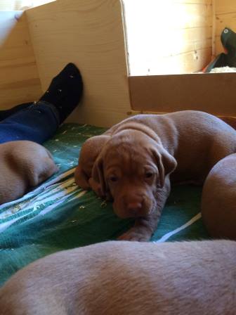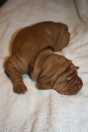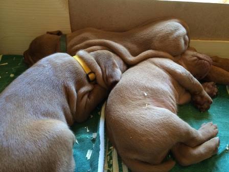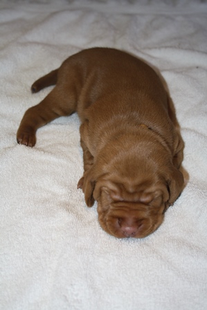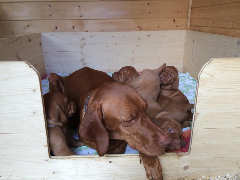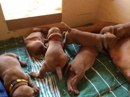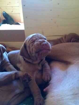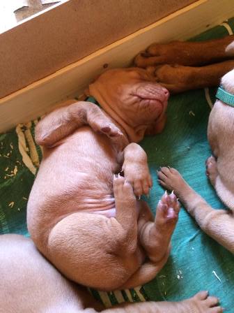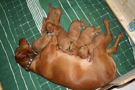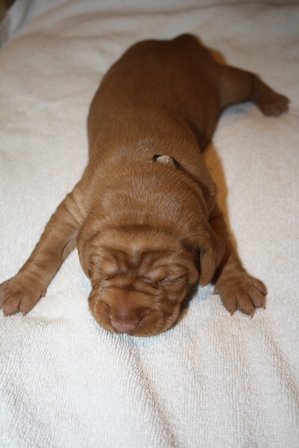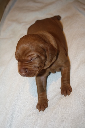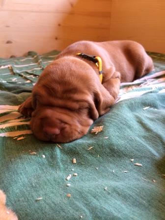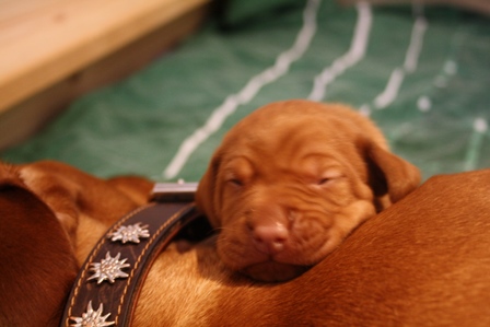 Bei 2 der 6 öffnen sich die Augen. Die "rote" Hündin hat sie bereits halb offen und die "graue" Hündin beginnt gerade mit kleinen Gucklöchern. Dann wird das Gewusel in der Wurfbox wohl recht lebhaft in den nächsten Tagen.