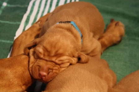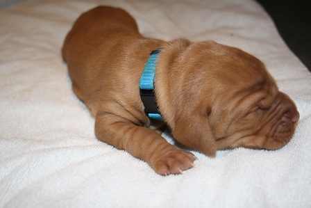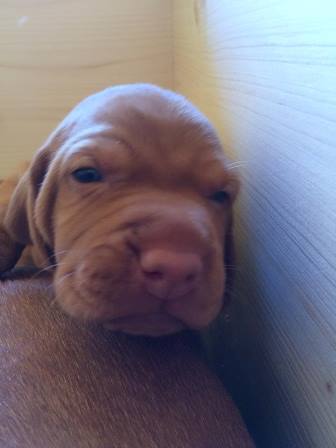 Die Augen und Ohren sind noch zu. So wie es sich für diesen Zeitabschnitt gehört. Nächste Woche jedoch werden Sie sie öffnen. Sie können dann aber noch nicht richtig sehen und hören, da sich die Augen zunächst noch an die ungewohnte Helle gewöhnen und reifen müssen. Richtig sehen und hören können die Welpen mit der 3. Woche etwa.