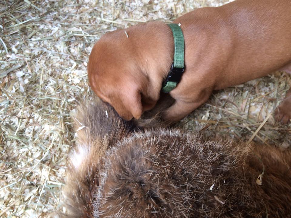 Heute war der erste Kontakt mit dem "Feind". Kaum war der Fuchs im Welpenhaus ausgelegt, da kamen alle schon sehr interessiert angelaufen. Sehr schön. Das Interesse ist sichtlich da. Und Mutti zeigt wies geht.